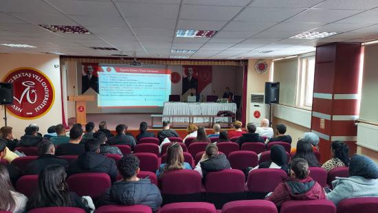 Toplantıda, Kontrol ve Otomasyon Teknolojisi Programı İşletmede Mesleki Eğitim ders danışmanı Öğr. Gör. Dr. Yunus Kara tarafından; işletmelerde yürütülecek mesleki eğitim sürecinde karşılaşılabilecek durumlar, olası sorunlar ve bu süreçte izlenmesi gereken adımlar hakkında öğrencilere kapsamlı bilgiler aktarıldı.
